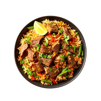 Ingrédients : Riz parfumé, émincé de bœuf au soja et oignons, carottes, soja , choux chinois, coriandre.