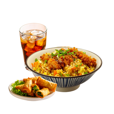 Ingrédients principaux : Riz sauté, légumes frais, œuf, viande ou tofu, sauce soja et aromates, boisson au choix 2 nems ou 2 gyoza