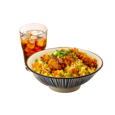 Ingrédients principaux : Riz sauté, légumes frais, œuf, viande ou tofu, sauce soja et aromates, boisson au choix