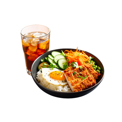 Ingrédients principaux : Riz sauté, légumes frais, œuf, viande ou tofu, sauce asiatique, boisson au choix